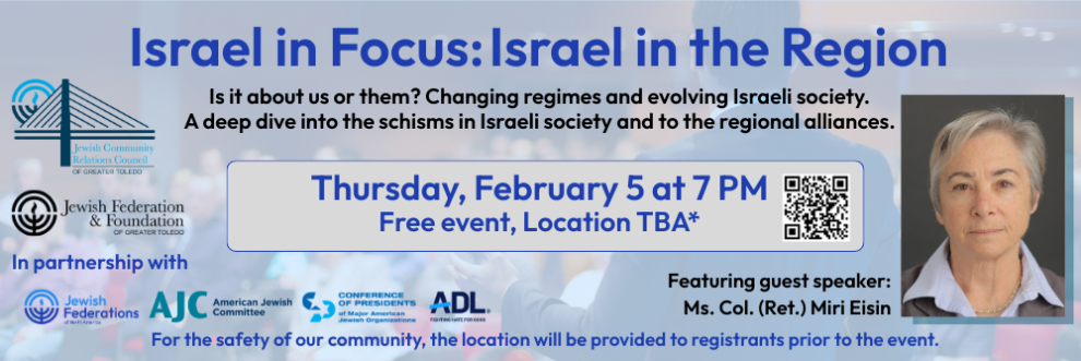 Is it about us or them? Changing regimes and evolving Israeli society. A deep dive into the schisms in Israeli society and to the regional alliances. Featuring guest speaker: Ms. Col. (Ret.) Miri Eisin, a senior fellow at the International Institute for Counterterrorism (ICT) at Reichman University in Herzliya, Israel. Retired Colonel Miri Eisin is a senior fellow at the International Institute for Counterterrorism (ICT) at Reichman University in Herzliya, Israel. Miri has a deep background in the intelligence, security and diplomacy worlds and is a frequent commentator on these issues in world media. During her 20 years in the Israel Defense Forces (IDF), she served in a variety of positions in Israeli military intelligence. In all her positions she was the first woman to serve in such a capacity.